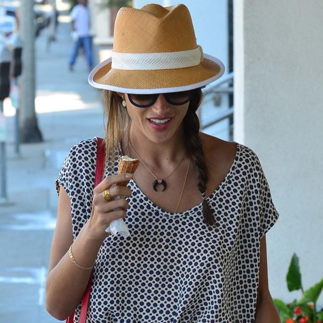 Alessandra Ambrosio cooled down with an ice cream as she enjoyed the sunshine in Brentwood, California. The supermodel wore a pretty printed sun dress and an orange fedora.