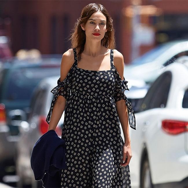 Alexa Chung hid her slender frame under a navy floral midi dress as she made her way to a lunch date with a friend in New York’s East Village.