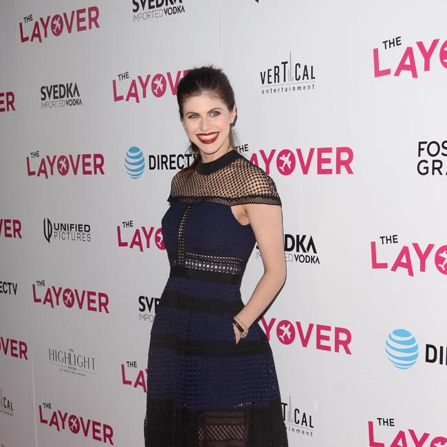 Alexandra Daddario showed off her beaming smile and pearly whites in a racy red lipstick as she posed for the cameras on the red carpet at the premiere of ‘The Layover’ in Los Angeles on Wednesday (23.08.17).