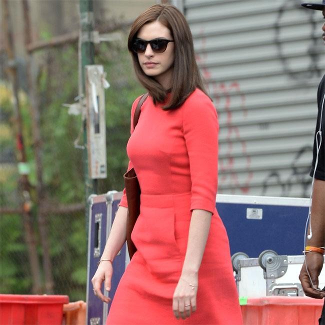 Anne Hathaway looked stylish in a sophisticated red dress and dark sunglasses as she headed on to the set of ‘The Intern’ in New York.