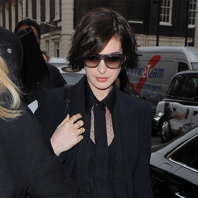 Anne Hathaway hid behind a pair of oversize black sunglasses as she arrived at a press junket for her new movie ‘Interstellar’ in London. The brunette beauty looked smart in a black tie and blazer.