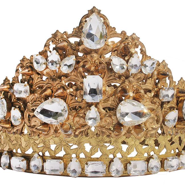"Brass crown is adorned with handset rhinestones next to spikes all along the crown. Measures 4.5” tall in front, and 7” in diameter.
