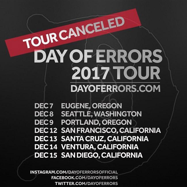 All Bill Ward/Day of Errors tour dates have been canceled and will not be rescheduled. Tickets will be refunded at point of purchase. Tickets purchased through an online ticketing agency will be automatically refunded. Please allow 7-10 days for refunds to appear. (sic)"