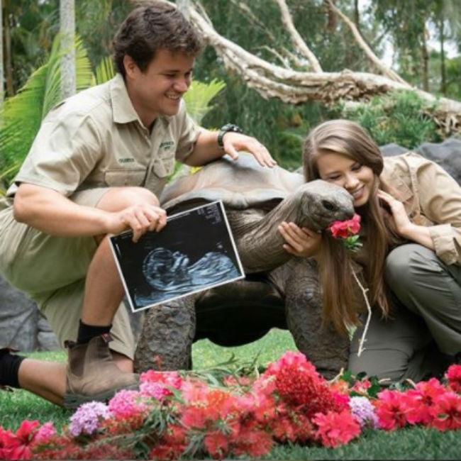 Bindi shared a photo of herself and Chandler with a sonogram photo and a giant tortoise surrounded by flowers and wrote on Instagram: "Baby girl, you are our world. [heart emoji]