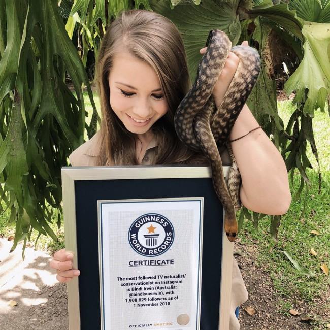 Bindi Irwin has won a Guinness World Records title for being the most followed TV conservationists on Instagram.