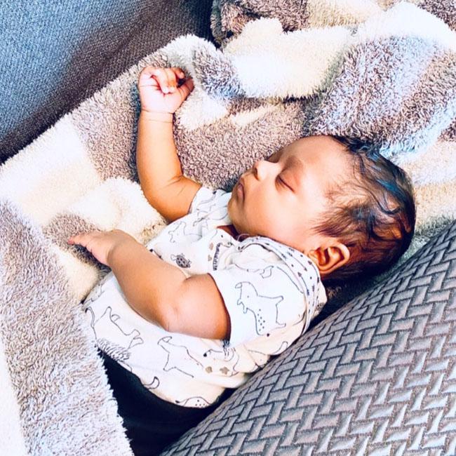 Model Olivia shared pictures of her son last week in a dog-themed image featuring the baby holding a knitted bone and lying on canine-patterned pillows.