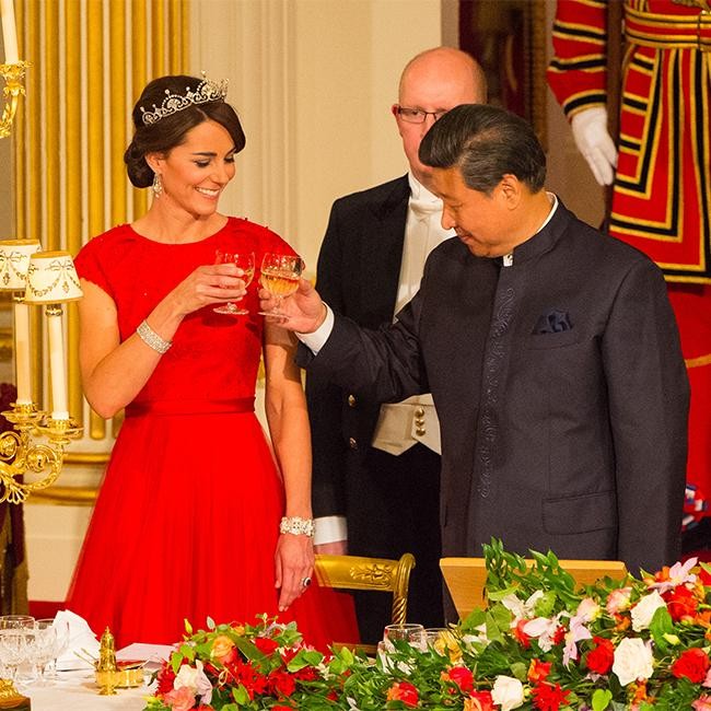 Britain’s Duchess of Cambridge stunned in a red dress and tiara as she took part in her first state banquet.