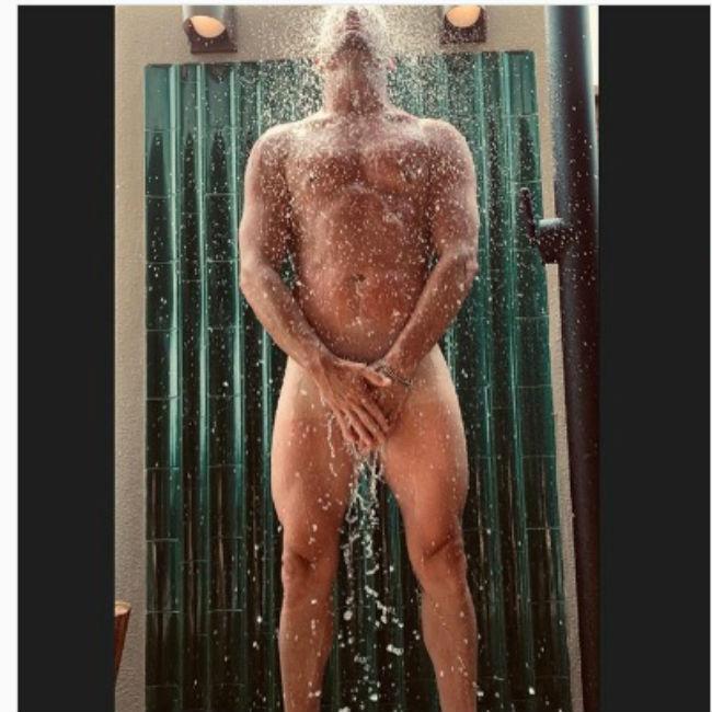 Channing shared the photo, in which he was completely naked but covering his modesty with his hands and being splashed by water, and explained: "I lost a game of Jenga to Jessica Cornish.