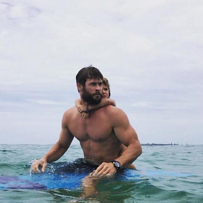 The ‘Thor’ actor also posted another clip of India riding a surfboard in shallow water.