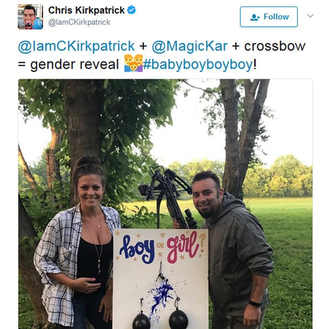 And the dark-haired vocalist – who married Karly in 2013 – captioned the sweet post: "@IamCKirkpatrick + @MagicKar + crossbow = gender reveal #babyboyboyboy! (sic)."