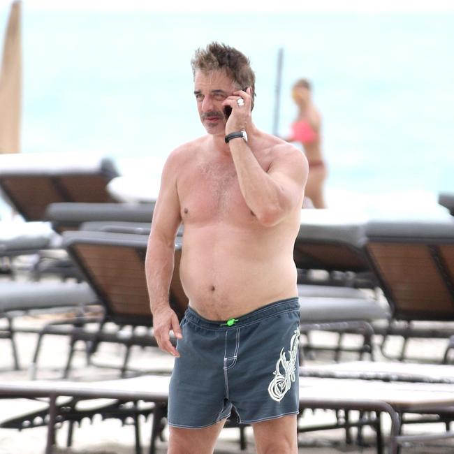 Chris Noth sported some facial hair as he relaxed at the beach, before being whisked back to his hotel in a golf cart to avoid the approaching rain storm on Miami Beach.