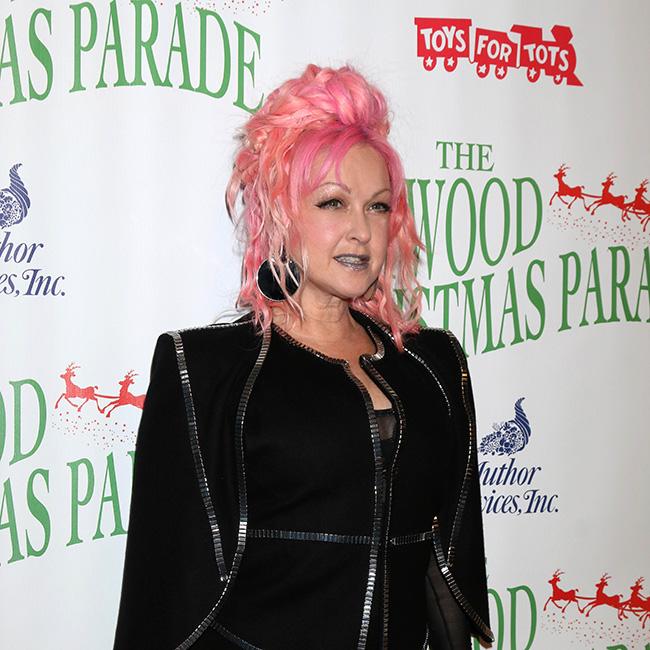 Cyndi Lauper showed off her signature candy floss pink locks in a stylish black jacket encrusted with gems on the edge.