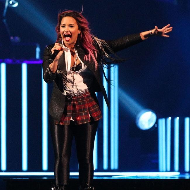 Demi Lovato showed off her punk rock style as she performed at her Neon Lights Concert Tour in Anaheim, California. The ‘Skyscraper’ singer sported a tartan skirt and blazer paired with an unbuttoned shirt which revealed her bra.