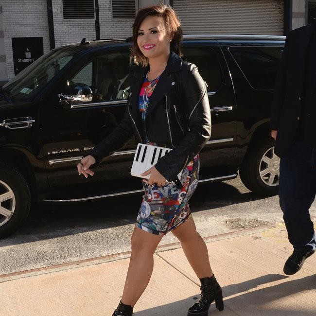 Demi Lovato smiled for the cameras as she arrived at the ‘Watch What Happens Live’ studio wearing a printed bodycon dress, leather biker jacket and a pair of patent leather boots.