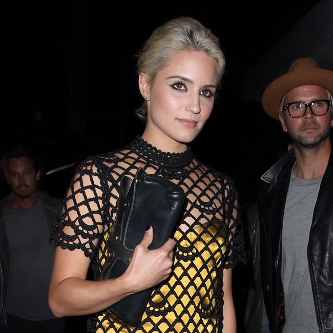 Dianna Agron looked stunning in a yellow and black dress as she arrived at the De Re Gallery in West Hollywood. The ‘Glee’ star wore her blonde hair in an up do and accessorised with a simple black clutch bag.