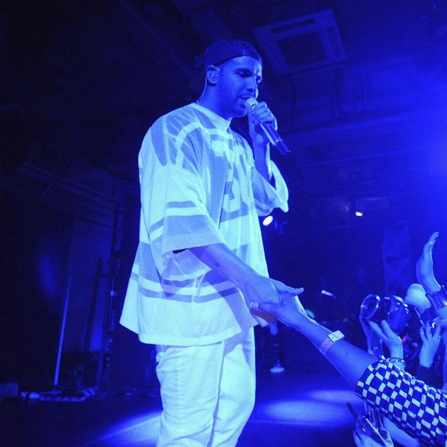 Drake held hands with a lucky fan during a performance at the REVOLT Brings the Music Revolution event at the Time Warner Center in New York. The rapper teamed his all white ensemble with a black hat as he hit the stage.