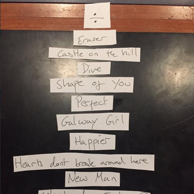 The 25-year-old singer – who has just made his musical comeback following a year-long hiatus – took to Twitter on Wednesday (11.01.17) to share a chalkboard with individual pieces of paper with 12 songs titles; ‘Eraser’, ‘Castle on the Hill’, ‘Dive’, ‘Shape of You’, ‘Perfect’, ‘Galway Girl’, ‘Happier’, ‘Hearts don’t break around here’, ‘New Man’, ‘What do I Know?’, ‘How Would You Feel (Paean)’ and ‘Supermarket Flowers’ (sic)"