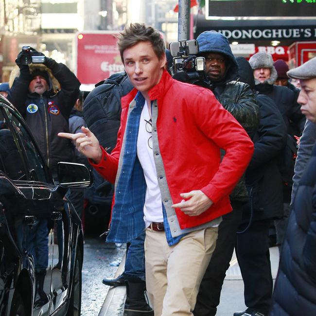 Eddie Redmayne arrived at ‘Good Morning America’ studios in a red Polo by Ralph Lauren jacket and some short cropped trousers in New York City.