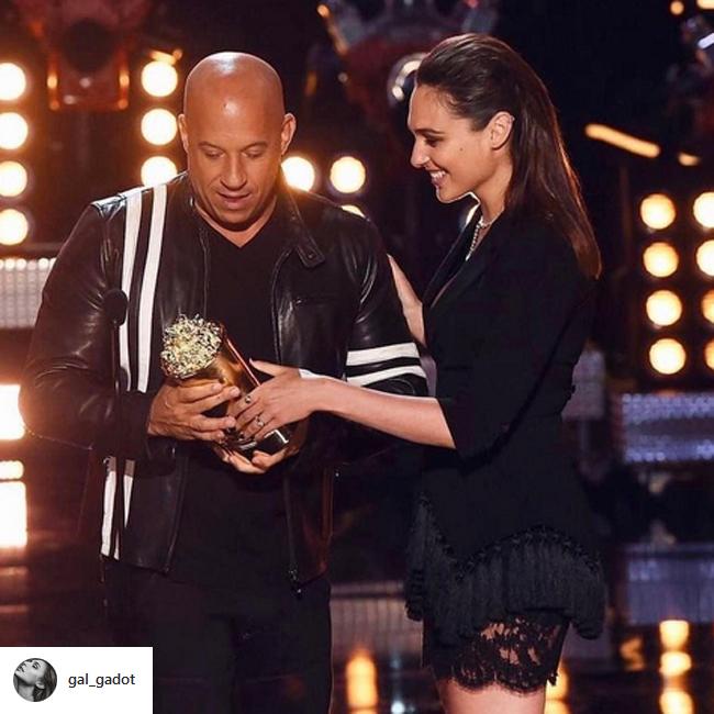 This post comes after the California-born hard man – who plays Dominic Torreto in the action film alongside Dwayne Johnson, Jason Statham, Michelle Rodriguez and the late Paul Walker – praised Gal as "family" and thanked her for making the award ceremony on Sunday (07.05.17) evening even "more special" for him by giving him the accolade.