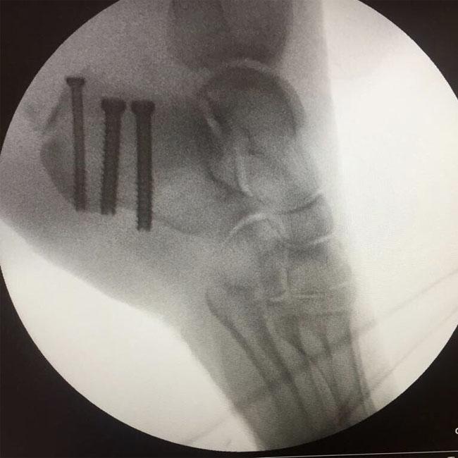 The X-ray shows that Dawn has had to have three screws in the heel bone of her foot to fix the break.