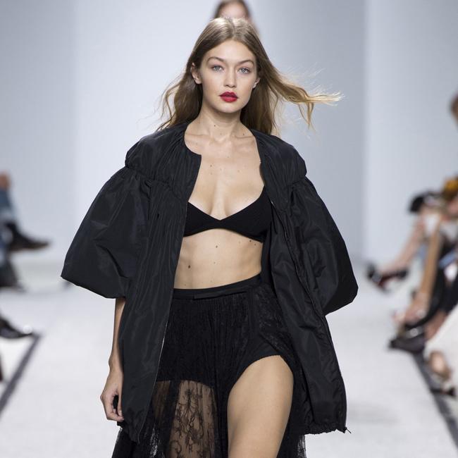 Gigi Hadid bared plenty of cleavage on the runway at the Giambattista Valli’s Paris Fashion Week SS17 show.