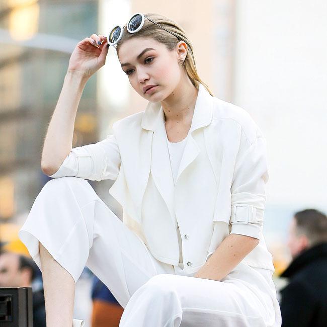 The fashion model – who is dating Zayn Malik – perched on a wall posing with her hands gripping her rounded shades and rocked minimal make-up.