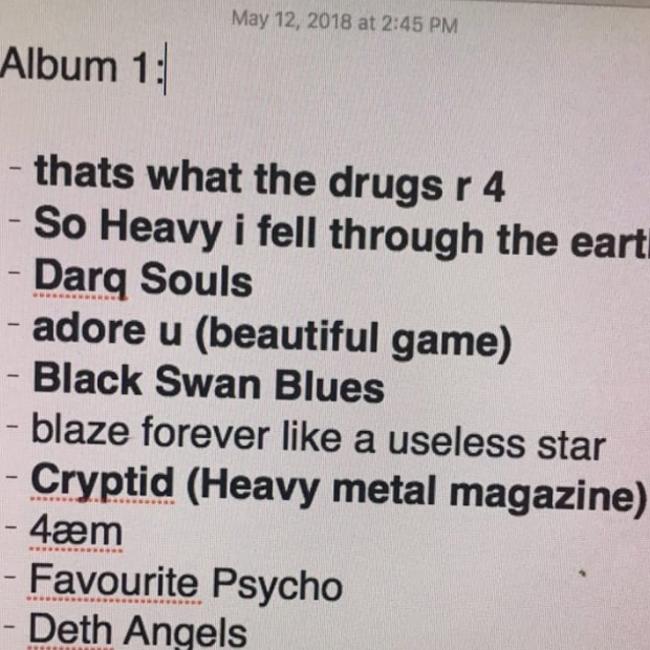 Among the song names were ‘thats what the drugs r 4’, ‘Darq Souls’, ‘blaze forever like a useless star’, ‘Favourite Pyscho’ and ‘Nymphs At Versailles’.