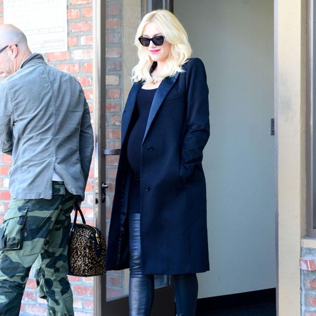 Gwen Stefani camouflaged her pregnancy bump in an all black outfit as she paid a visit to an acupuncture clinic in Los Angeles, California. The singer wore leather trousers with a long coat and brightened up the look with hot pink lipstick.
