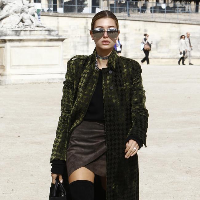 Hailey Baldwin looked effortless in a long green and black chequered coat and oversized sunnies whilst spotted in Paris during Fashion Week.