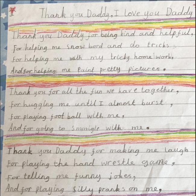 "Thank you Daddy for being the best in evr. I love you Daddy and hope you have a special day. Harper xoxoxoxo. [sic]"