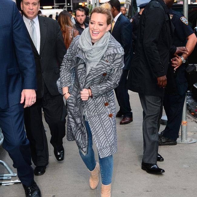 Hilary Duff looked stylish in a pair of blue jeans and a grey patterned coat and scarf as she arrived at the studio for her appearance on ‘Good Morning America’ in New York City.