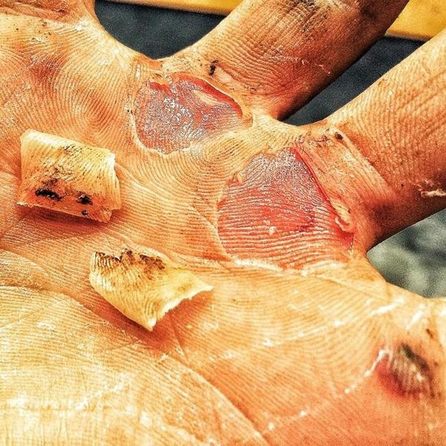 Accompanying the graphic image, he wrote on Twitter: "Ripped my hands apart on a move called a Tombé on the Aeriel Hoop! I taped up & got back on tho! @BBCOne #Tumble (sic)"