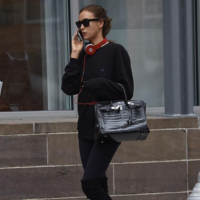 Irina Shayk headed to the gym in New York City’s West Village wearing an all black outfit and a pair of red beats headphones around her neck. The ‘Hercules’ actress chatted away on the phone as she kept a low profile in large black shades.
