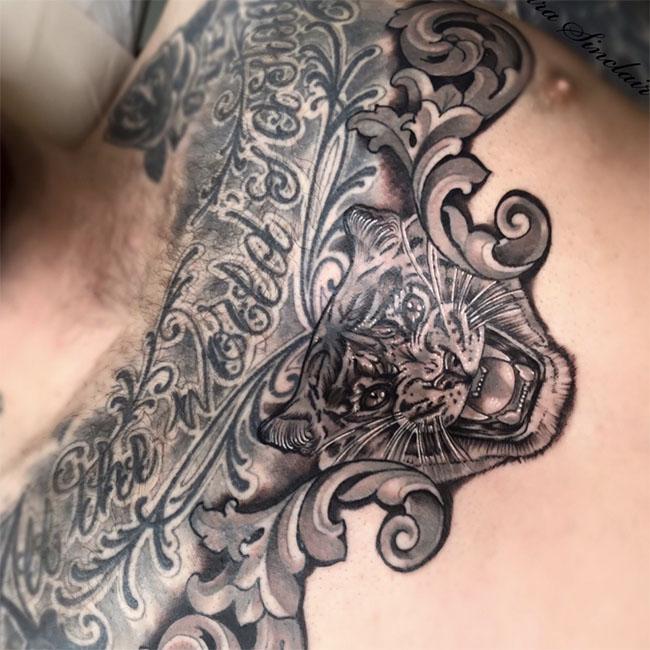 The new tattoo features a tiger roaring in the centre, whilst the words, ‘All the world’s a stage’, a line from William Shakespeare’s play ‘As You Like It’, is inked above.