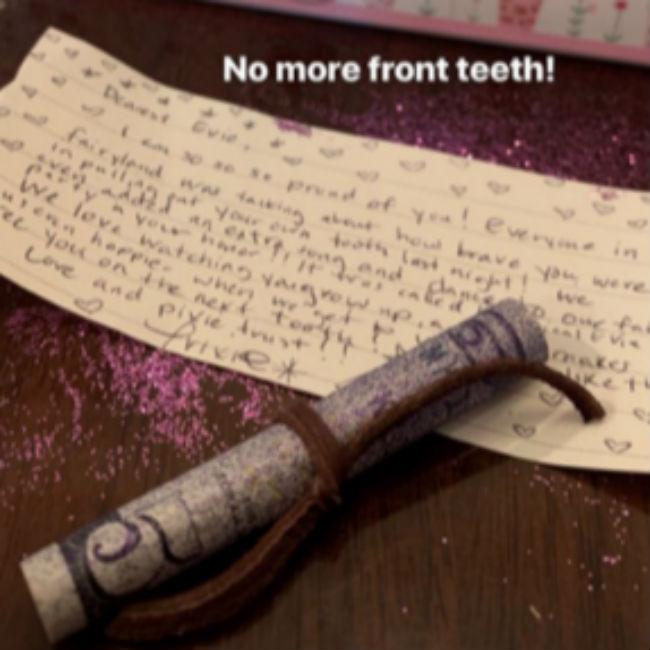 The handwritten note said: "Dearest Evie, I am so so so proud of you! Everyone in fairyland was talking about how brave you were in pulling your own tooth out last night! We even added an extra song and dance to our fairy party in your honor! It was called Magical Evie. We love watching you grow up. … See you on the next tooth! Love and pixie trust, Trixie."