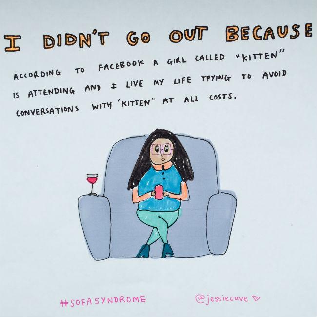 Another was a girl clutching her phone and holding a glass of wine and said: "I didn’t go out because according to Facebook a girl called Kitten is attending and I live my life trying to avoid conversations with Kitten at all costs."