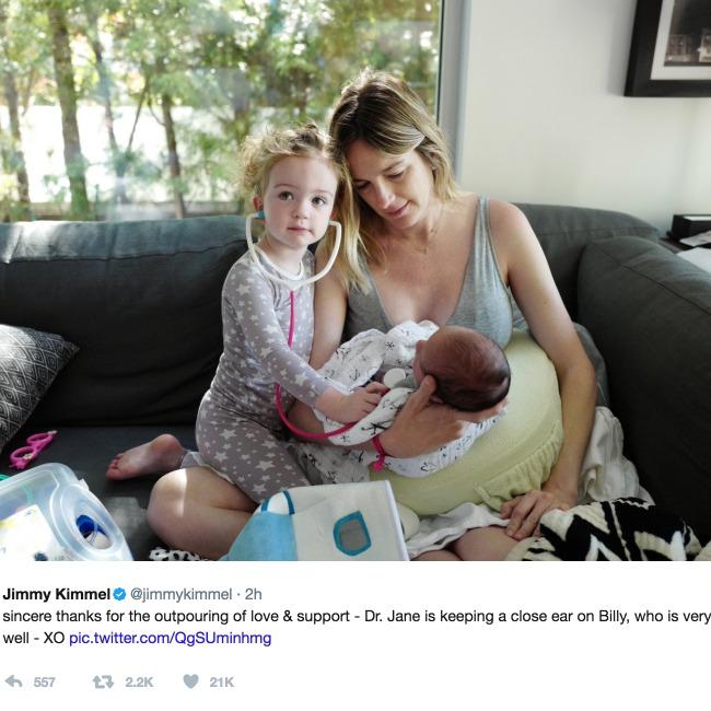 After opening up about the ordeal during his monologue on Monday’s (05.01.17) episode of ‘Jimmy Kimmel Live’, the show’s host – who also has daughters Katie, 25, and Jane, two, as well as 23-year-old son Kevin – took to Twitter to thank his fans for their kind words of support.