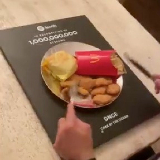 Joe Jonas celebrated DNCE’s ‘Cake by the Ocean’ reaching a billion streams by eating a McDonald’s from his Spotify plaque.