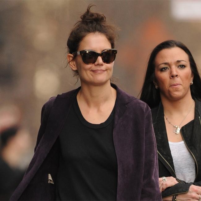 Katie Holmes looked cheerful as she made her way to the set of her new TV series ‘Dangerous Liaisons’ with a friend. The actress wore her hair in a lose top knot with retro sunglasses.
