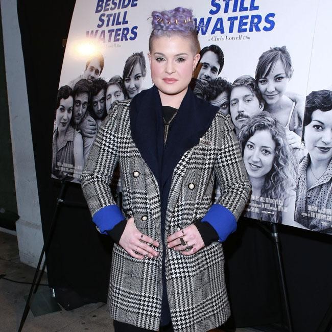 Kelly Osbourne wore her braided lilac locks in a top knot as she stepped out at the Los Angeles premiere of ‘Beside Still Waters’ in a monochrome plaid coat with contrasting blue cuffs.