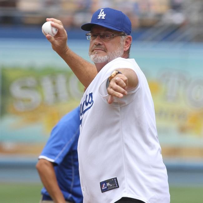Kelsey Grammer played pitcher as he threw the first ball before the game between his team the Los Angeles Dodgers and the Chicago Cubs last weekend.
