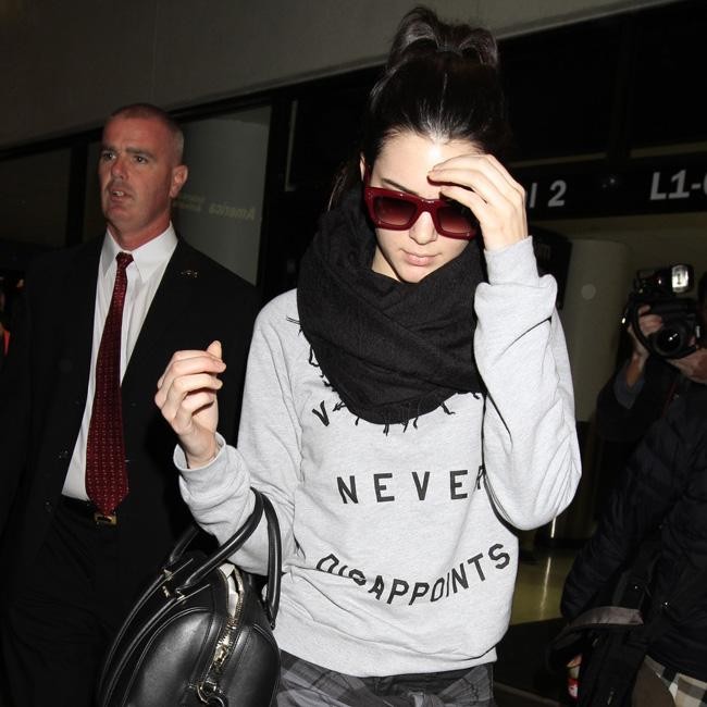 Kendall Jenner tried to keep a low profile when being mobbed by photographers upon her return to Los Angeles following a busy Paris Fashion Week. The reality star dressed down in a grey sweater wrapped a black scarf around her neck.