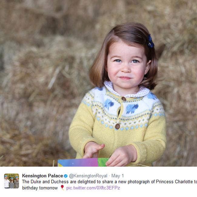 The image, which captures Charlotte wearing a yellow knitted cardigan with sheep detail on it whilst at the family home in Anmer Hall, Norfolk, read: "The Duke and Duchess are delighted to share a new photograph of Princess Charlotte to mark her second birthday tomorrow (sic)."