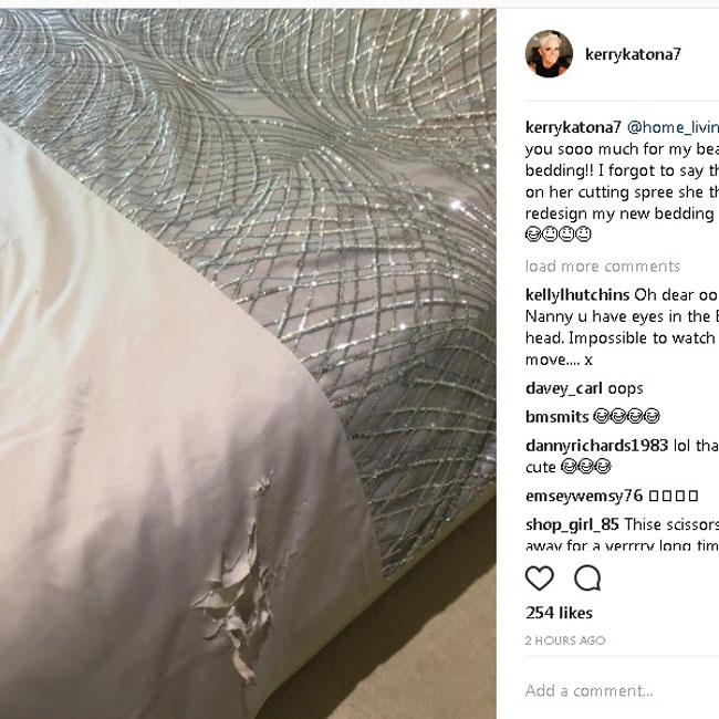 Alongside a picture of the damaged linen, she wrote on Instagram: @home_living_furniture thank you sooo much for my beautiful new bedding!! I forgot to say that when dj went on her cutting spree she thought she would redesign my new bedding @kylieminogue (sic)"