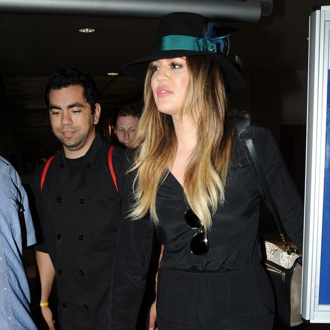 Khloe Kardashian sauntered in late through LAX Airport in Los Angeles wearing a black ensemble, silver heels and a hat decorated with green ribbon.