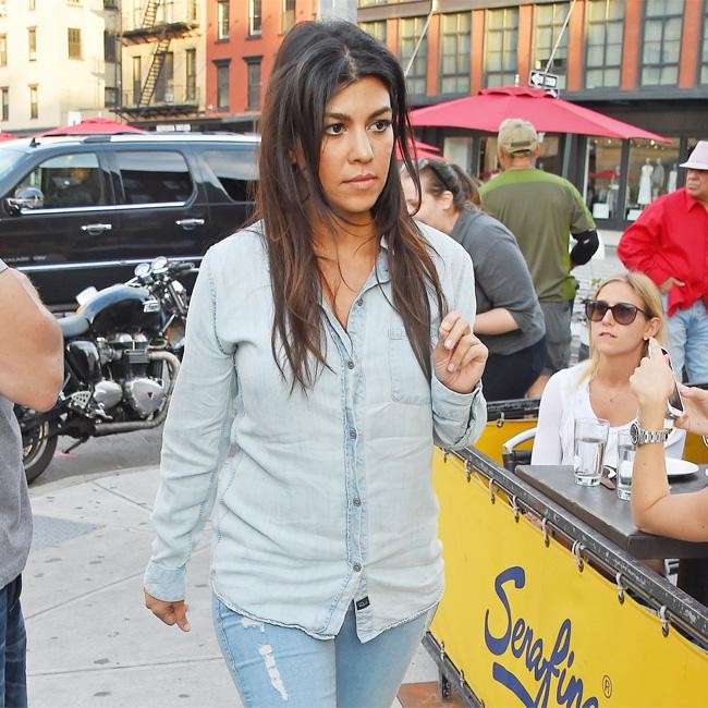 Kourtney Kardashian teamed a denim shirt with ripped jeans for a lunch date with her sister Kim at Serafina restaurant in New York.