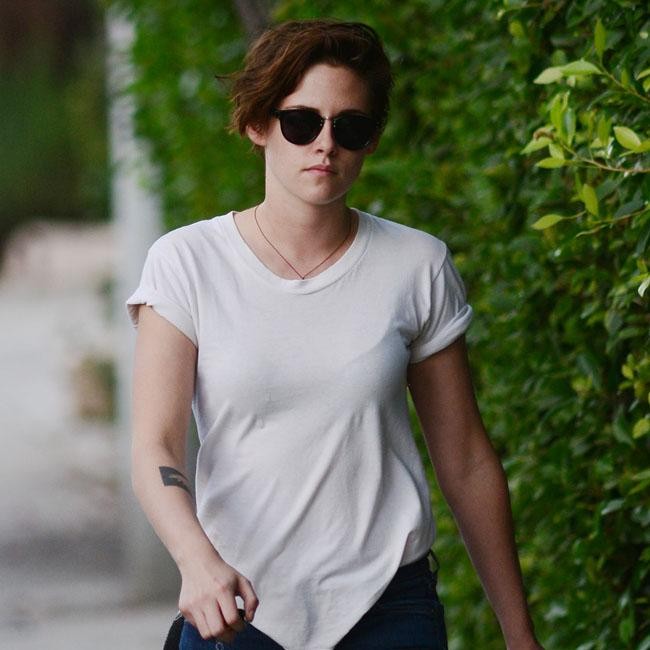 Kristen Stewart continued her recent tomboy look by stepping out in a pair of rolled up blue jeans, converse and a plain white t-shirt. The ‘Twilight’ actress wore her cropped hair to the side and added a pair of dark sunglasses.