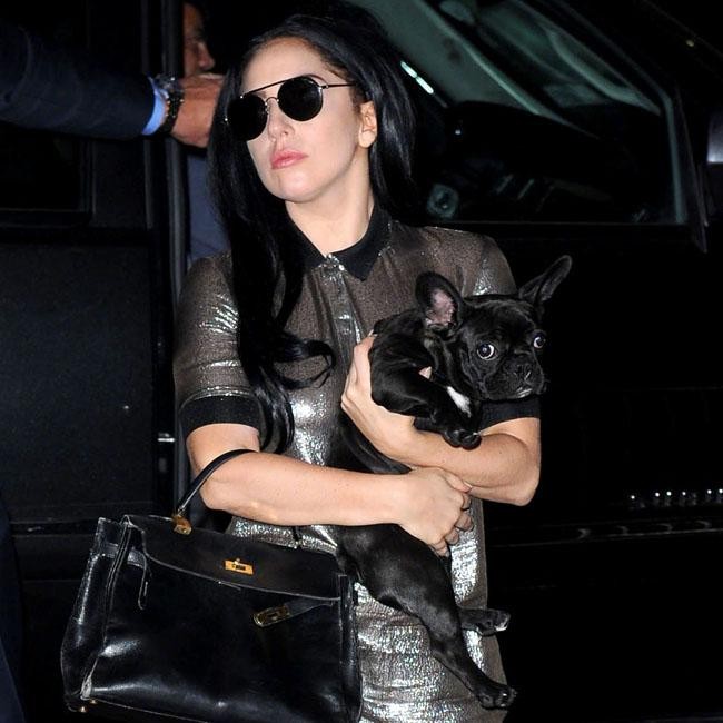 Lady Gaga ditched her curly wig during a visit to Avatar recording studio in New York. The brunette singer was seen leaving wearing shades, a futuristic silver one-piece with her hair down and carrying her beloved pooch.