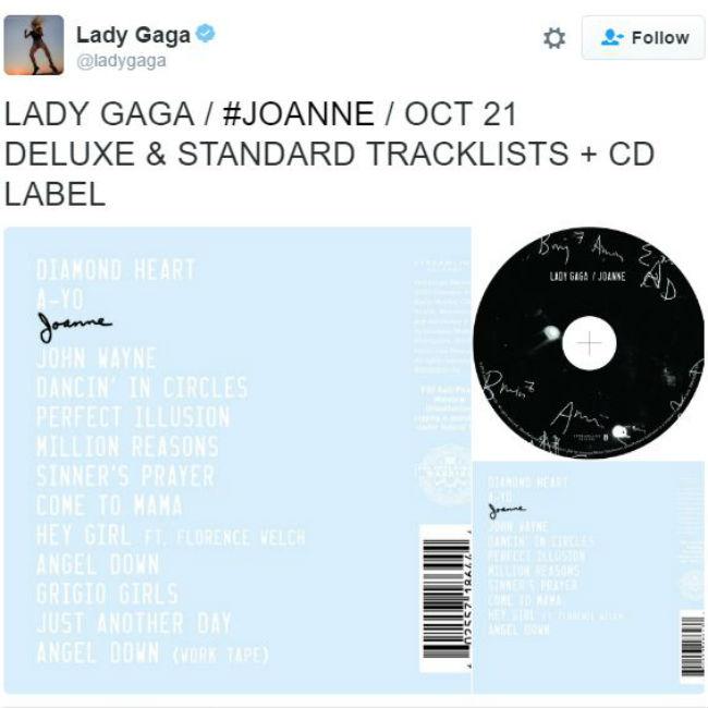 Gaga posted the tracklists on Twitter and wrote: "LADY GAGA / #JOANNE / OCT 21 DELUXE & STANDARD TRACKLISTS + CD LABEL (sic)."
