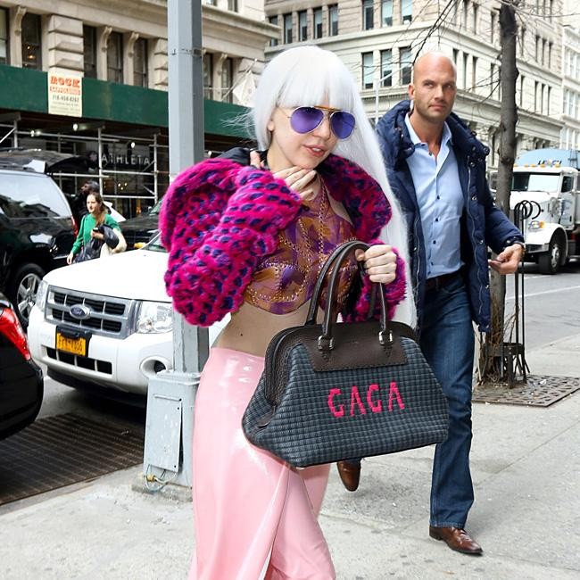 Lady Gaga showcased her bizarre style in a cropped jacket, pink trousers and a personalised handbag as she strolled around New York City.